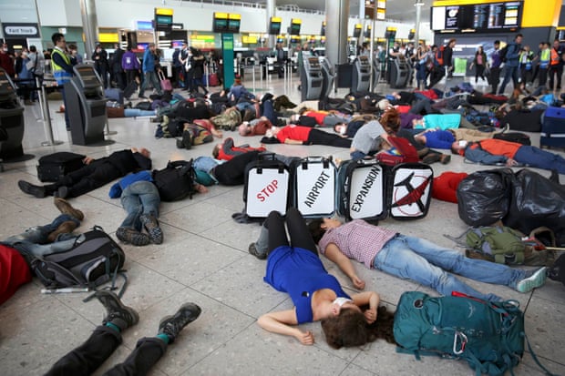 Общественное движение Reclaim the Power выступило выразителем интересов жителей районов, прилегающих к аэропорту Хитроу, в их протесте против строительства третьей взлетной полосы. В субботу активисты устроили лежачий флэшмоб в Терминале 2: люди в респираторах или пылезащитных масках, вооруженные плакатами с протестными лозунгами, упали на пол посреди зала регистрации пассажиров.
