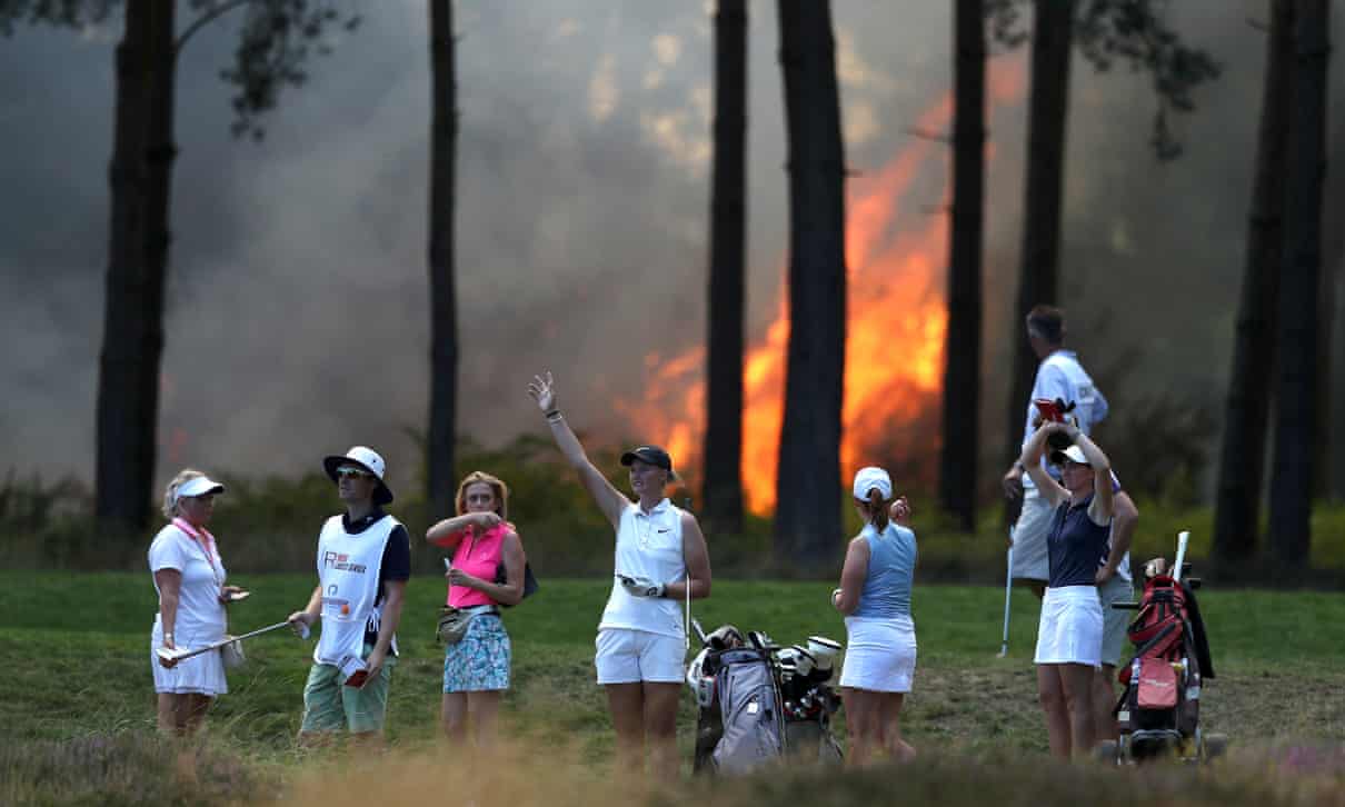 Лесной пожар в пятницу днем охватил не менее 40 гектаров биологического парка Chobham Common в Суррее. Через несколько часов огонь вплотную подошел к территории гольф-клуба во владениях Wentworth Easte, на котором в это время проводился финал женского турнира Rose Ladies Series; соревнование было остановлено, участники и зрители, а также местные жители прилегающих домов были эвакуированы.