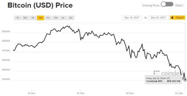 Цена криптовалюты ВТС стремительно падает. После достижения 19 тысяч долларов биткоин почти 40% от стоимости потерял.